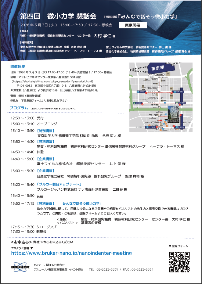 ナノインデンター利用者をはじめとする実務者の皆様から、微小力学試験について相談・議論できる場へのご要望を受け、物質・材料研究機構・大村先生のご尽力のもと「微小力学懇話会」を立ち上げ、継続的に開催してまいりました。本年は、昨年に続く第4回の開催となります。